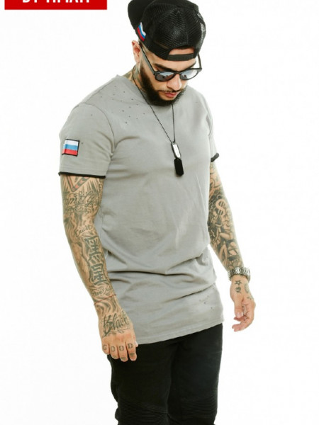 СерыйМужская футболка Блэк Стар Россия – стильный вариант для повседневного гардероба. Модель из коллекции знаменитого артиста Тимати изготовлена из высококачественного хлопка. Она представлена в сером цвете, который отлично комбинируется с другими оттенками. Дизайн изделия прост и лаконичен, рукава отделаны черными вставками и нашивкой триколор, а на спине имеется надпись Блэк Стар.
